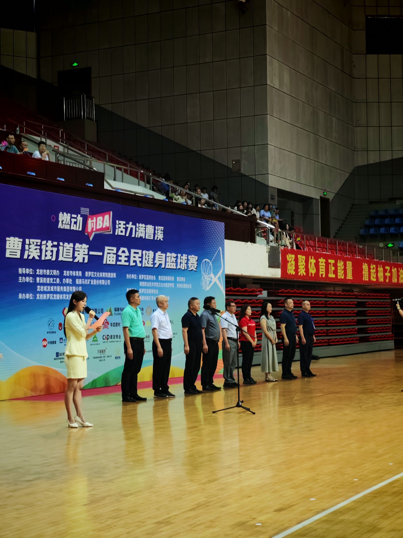 2025年6月17日,文化与旅游学院积极组织一支由优秀学生组成的志愿者团队,在龙岩市体育公园主馆参与曹溪街道第一届全民健身篮球赛开幕式主持及礼仪工作,学院专职副书记石颖、团委梁红老师带队参加。
