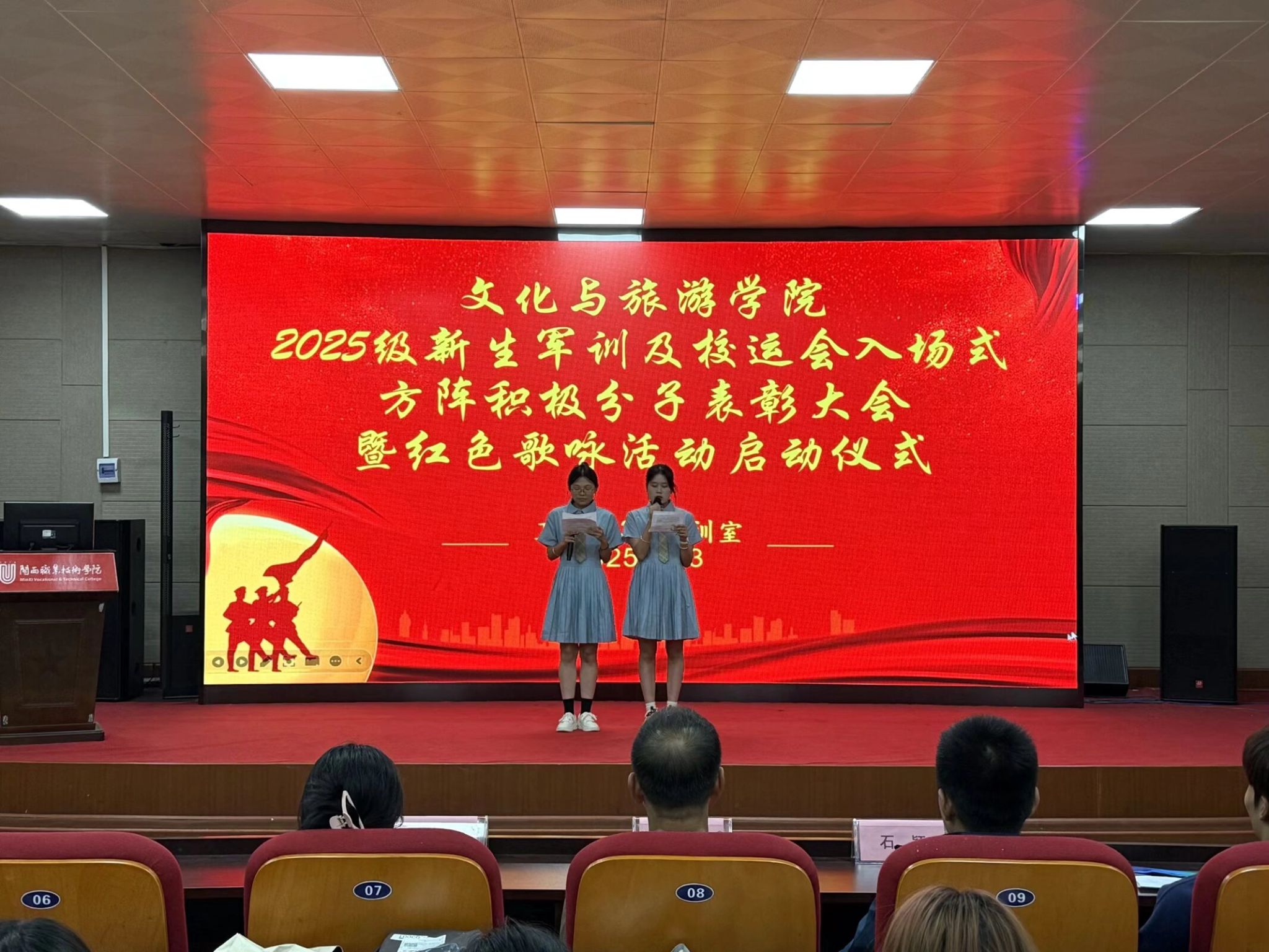 为表彰在军训和运动会中的优秀代表,也为凝聚文旅师生的力量,2025年11月3日,我院在卫培楼3D实训室举行了充满激情而热烈的表彰仪式暨红色歌咏活动启动仪式。