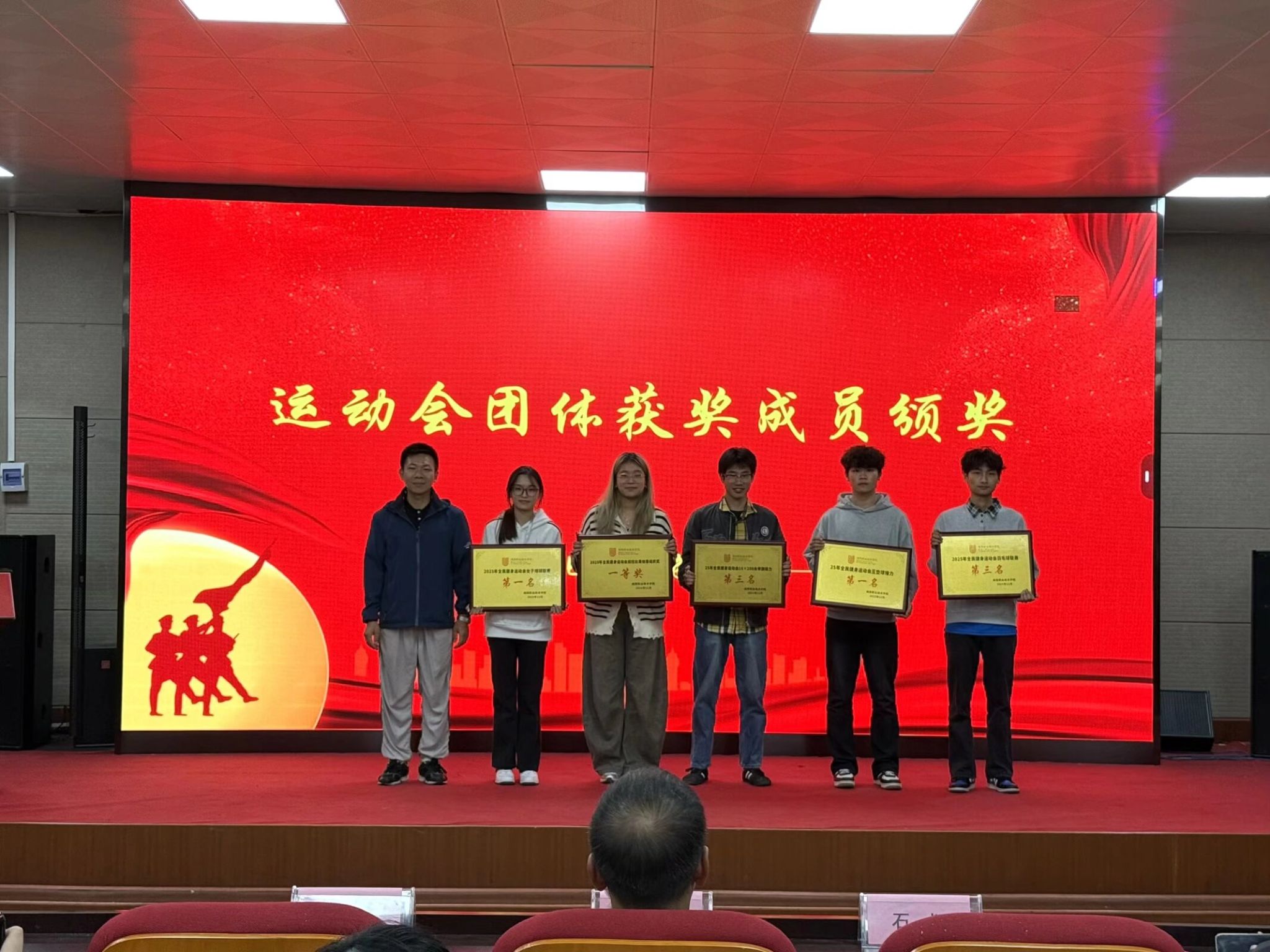 颁奖环节由学院老师为运动会开幕式标兵、军训方阵标兵颁奖,这些标兵以良好的精神风貌展现了青春风采;同时为运动会各项目获奖成员颁奖,他们在赛场上挥洒汗水、奋勇争先,用成绩证明了自己的实力;最后为运动会团体项目获奖集体颁奖,集体项目的荣誉凝结着团队的默契与拼搏,每一次颁奖都伴随着热烈的掌声。