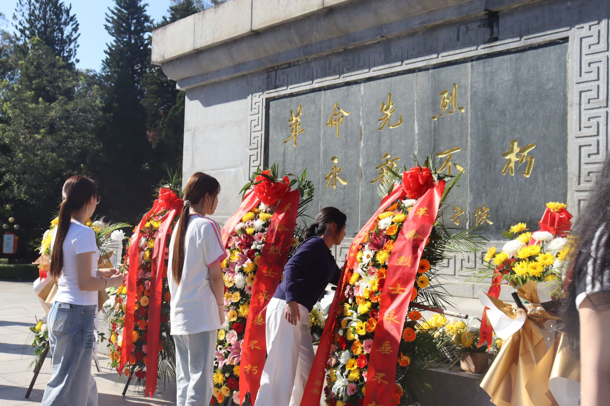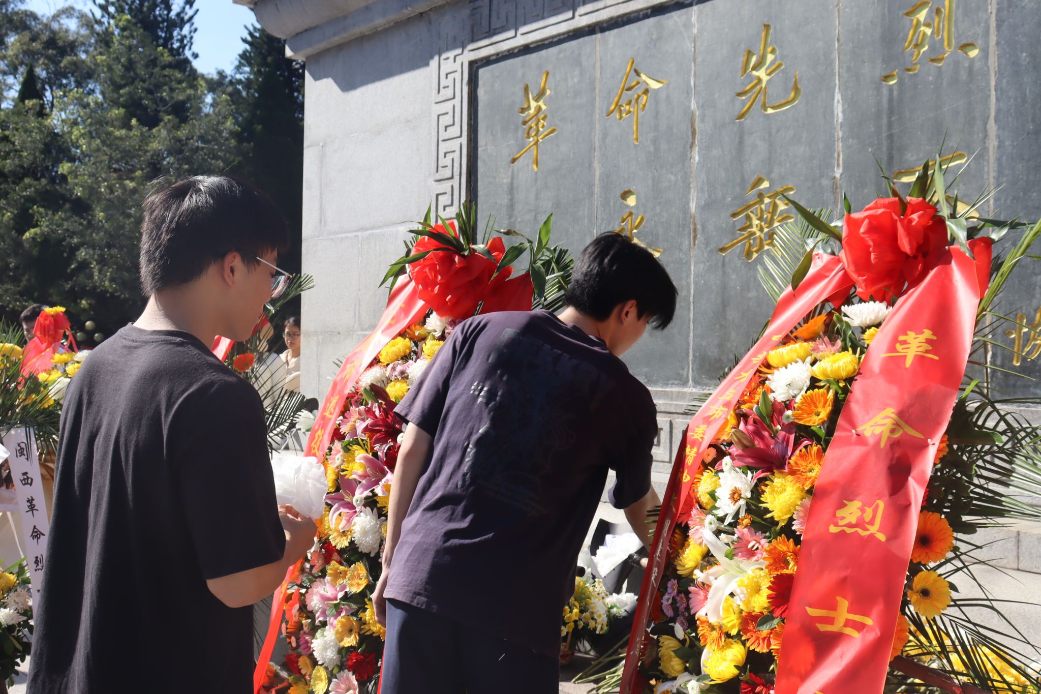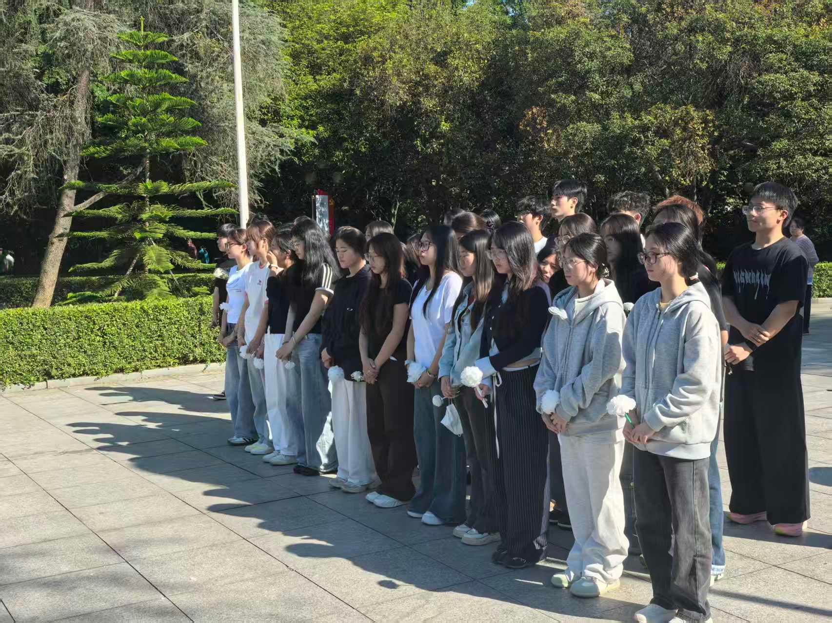 默哀仪式结束后,师生们手持洁白小花,缓步走向革命烈士纪念碑,郑重地将小白花敬献于碑前,绕行纪念碑一周,驻足瞻仰。一朵朵洁白的小花,承载着师生们对先烈的深切缅怀与无限敬仰;一次次庄重的驻足,诉说着新时代青年对革命精神的传承与坚守。