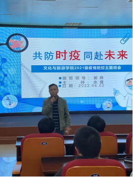 面对复杂、严峻的防疫形势,按照学校工作部署,从严从实从紧抓好下一步学生疫情防控工作,文化与旅游学院学生工作领导小组在周末期间迅速行动,召开主题班会工作部署会暨各班级主题班会,众志成城抗疫情,齐心协力渡难关。