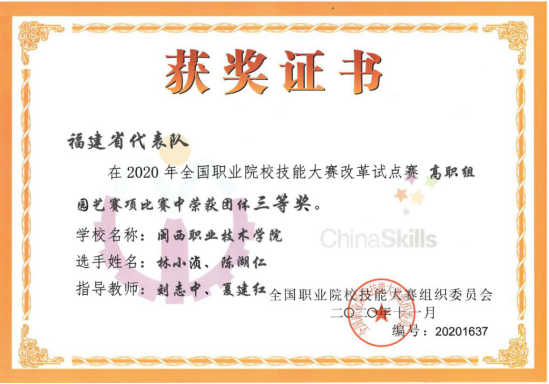 11月6日至9日,2020年全国职业院校技能大赛改革试点赛高职组园艺赛项在山东潍坊举行,文化与旅游学院学生林小浈、陈湖仁组成的代表队代表福建省参赛(指导老师刘志中、夏建红),经过4天22小时的拼搏,喜获全国职业院校技能大赛“园艺”赛项三等奖。