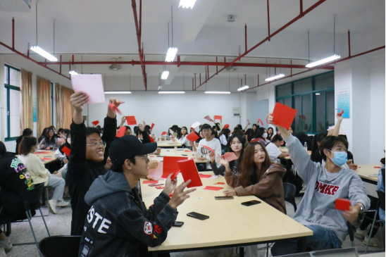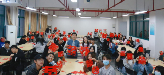 讲座中,刘白老师用风趣生动的语言阐述了什么是客家人、客家人的生活习性;客家剪纸与北方剪纸的区别;客家剪纸的用途;客家剪纸的未来和发展等内容,现场笑声不断。之后,刘白老师手把手教同学们两刀剪“囍”字,通过折、剪,同学们很快完成了属于自己的红“囍”字。