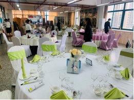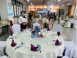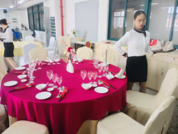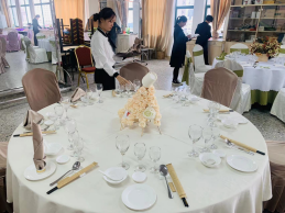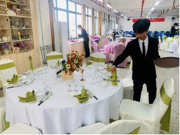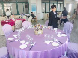 实践技能操作在万源楼714餐厅实训室中进行。1+X餐饮服务管理(中级)实践操作主要考核学生中餐摆台的技能水平和主题宴会的设计水平,口试主要考核学生对服务过程中遇到的案例进行分析的能力和专业知识的掌握水平。摆台中学生落落大方,技能操作娴熟;口试中,学生能熟练的运用专业知识回答评委的问题。