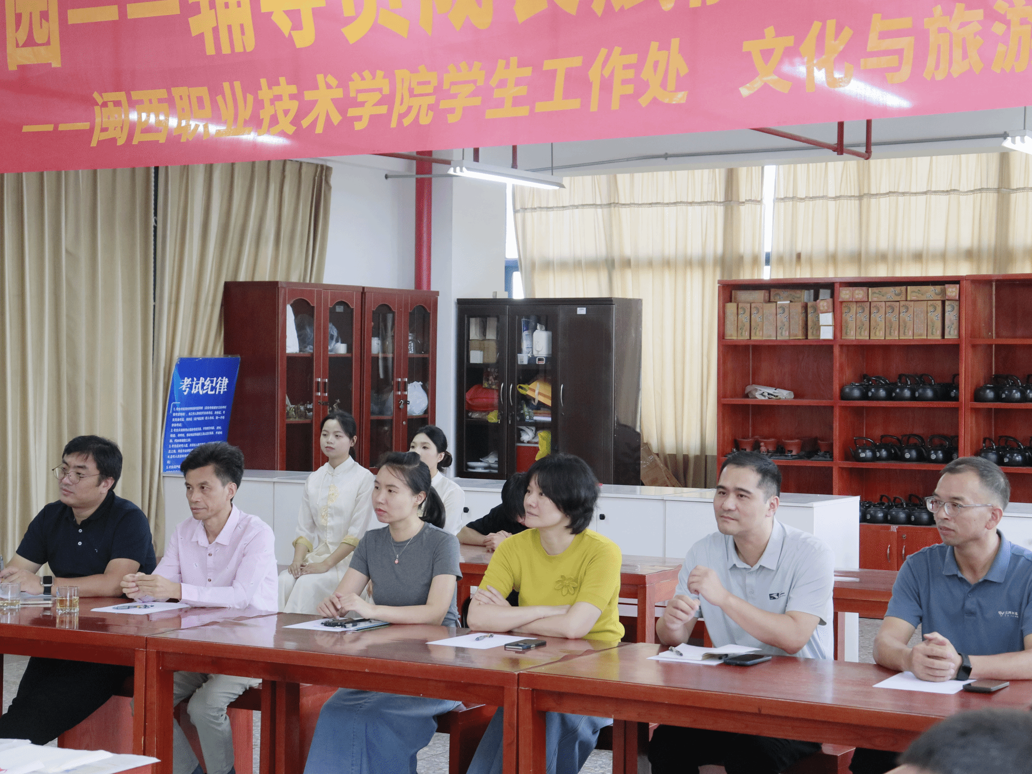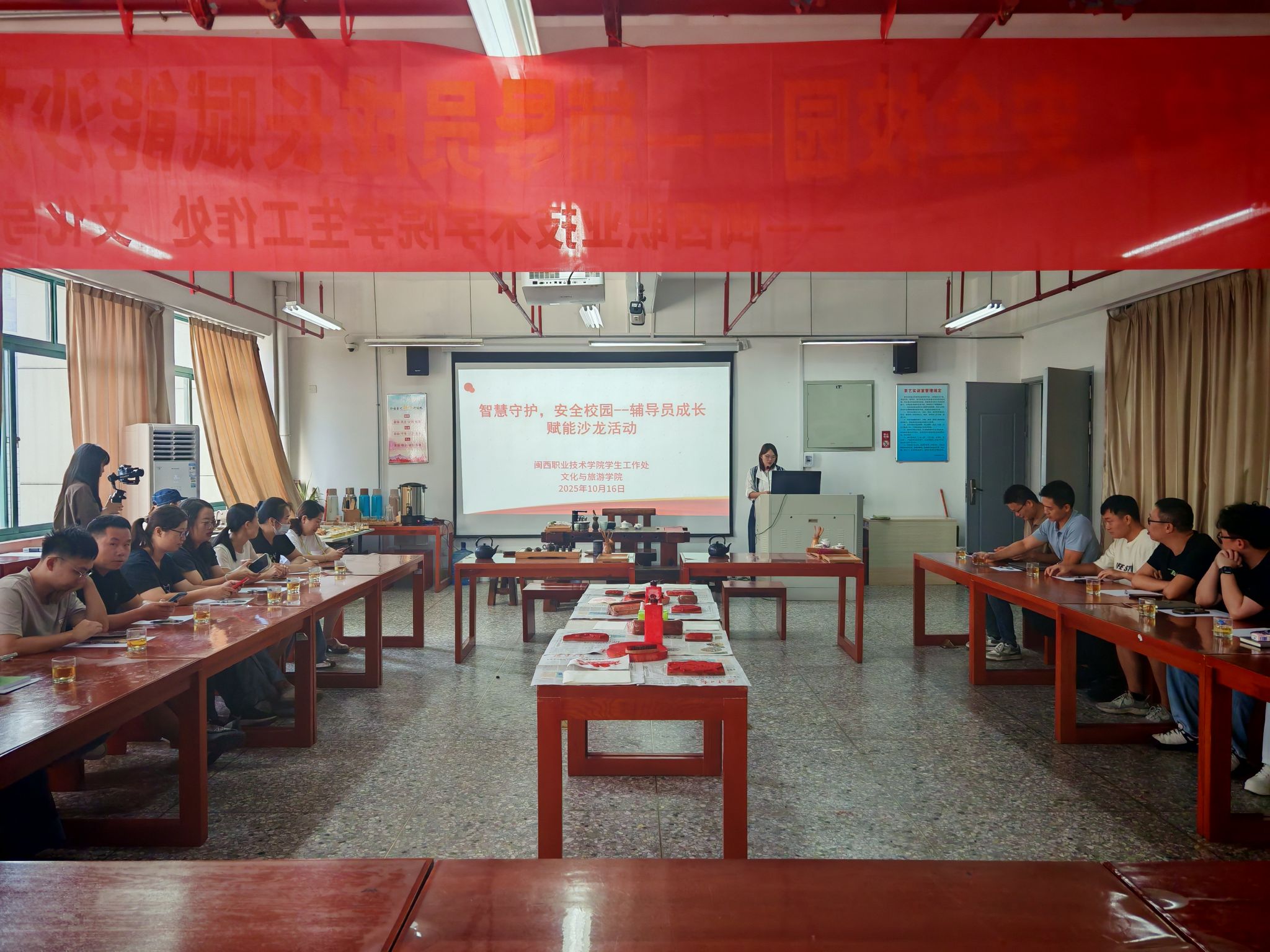 10月16日下午,学院万源楼702茶艺室摇身一变,成了安全的“智慧岛”。一场别开生面的辅导员沙龙交流会,由学生工作处精心策划,文旅院倾情承办,MG冰球突破官网副校长连玲娜、校团委书记陈愉、学工处处长曹熠城、学工处副处长王阳根、文旅院党委书记陈荣坤、文旅院学工工作负责人石颖及20多位辅导员齐聚一堂,在茶香袅袅与雕版印刷的古韵中共赴这场安全与智慧的双重盛宴。