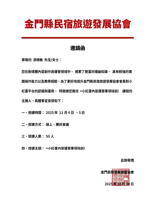 此次培训是协会 “民宿品牌数位初阶行销推广计划课程”的重要环节。协会聚焦金门民宿“线上曝光不足、内容吸引力弱” 的痛点。文化与旅游学院游婧敏老师,针对金门民宿的地域特色与“数位初阶行销”的计划定位,量身定制培训方案。从“如何挖掘具有金门特色的民宿与旅游内容”,到“如何设计符合小红书用户喜好的笔记结构,降低初阶从业者操作门槛”,教师反复打磨课程内容,确保每一个知识点都能贴合会员们的实际运营需求,真正做到 “按需授课、学以致用”。