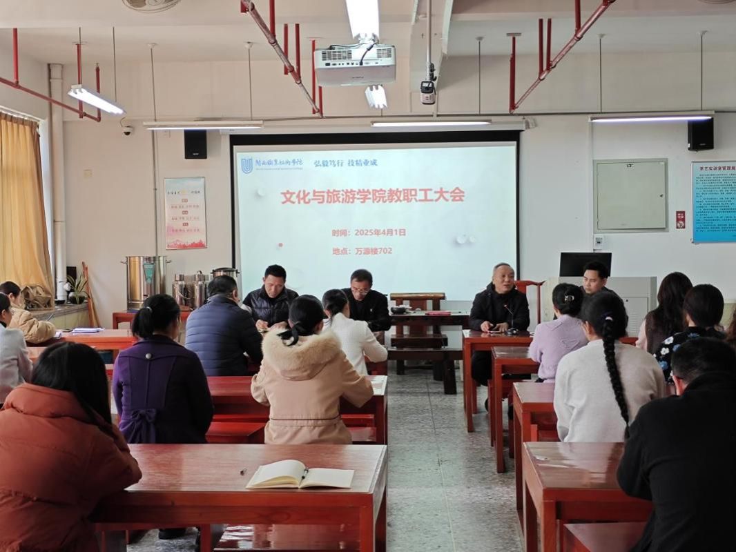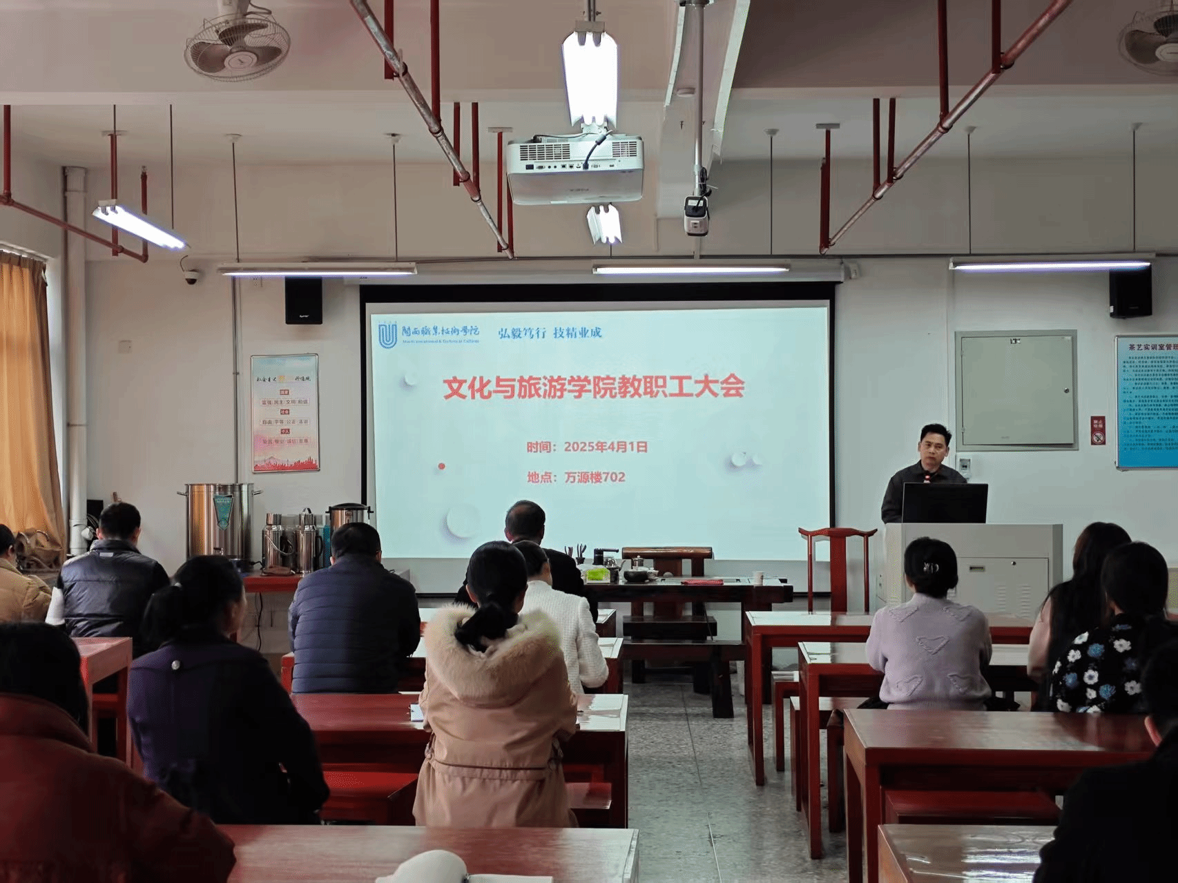 4月1日下午,文化与旅游学院在万源楼702茶艺室召开教职工大会,挂钩校领导张源峰副校长出席本次会议并发表重要讲话。