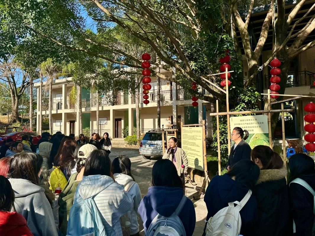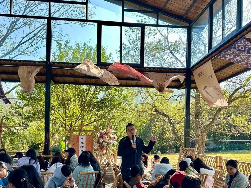 茶园主理人陈建融先生对师生们的到来表示热烈欢迎,并亲自担任“导游”与“讲师”。他首先分享了自身从台湾企业管理交换生,到丽江开民宿,再到苏州工作,最终扎根龙岩创建茶文化园的丰富职业经历。面对同学们的踊跃提问,陈先生坦诚分享:他谈到自己的每一次转型都源于对生活方式的探索与对乡土文化的热爱,是将管理学思维创造性应用于文旅实践的过程。同时,他还分享了在丽江与苏州观察到的不同地域的空间营造与人文氛围,这些经历深刻影响了他对“场所精神”的理解。他坚定地认为,“选择回到土地,做一件有生命力、能传承的事”是最正确的决定,鼓励同学们找到内心真正认同的事业。