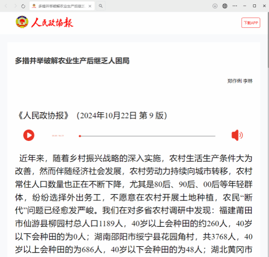 2024年10月22日,文化与旅游学院院长李琳撰写的《多措并举破解农业生产后继乏人困局》文章在《人民政协报》第九版被刊登采用,全文如下: