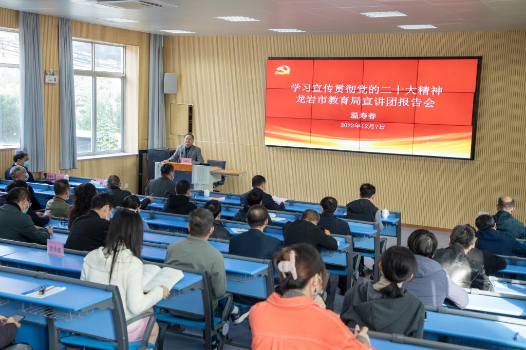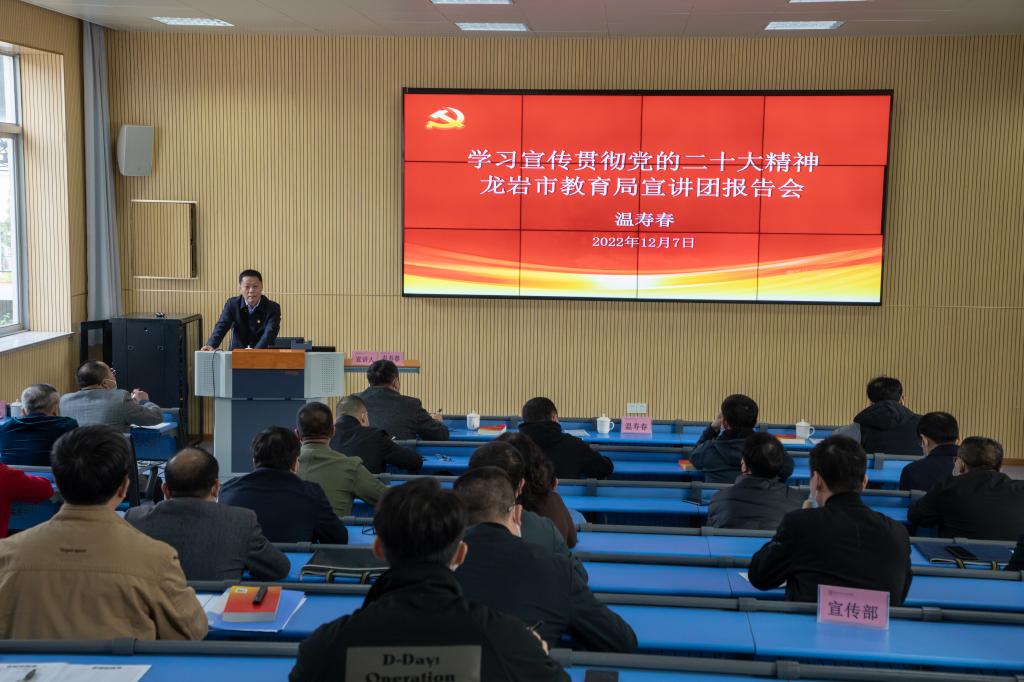 12月7日下午,学习宣传贯彻党的二十大精神龙岩市教育局宣讲报告会在MG冰球望云楼阶一学术报告厅举行。龙岩市教育系统学习贯彻党的二十大精神宣讲团成员、中共龙岩市委教育工委委员、教育局党组成员、教育局副局长温寿春作宣讲报告。校党委理论学习中心组成员、全校中层正职(含主持工作负责人)、机关党总支第一党支部党员参加报告会。校党委委员、副校长卢兆梅主持宣讲报告会。