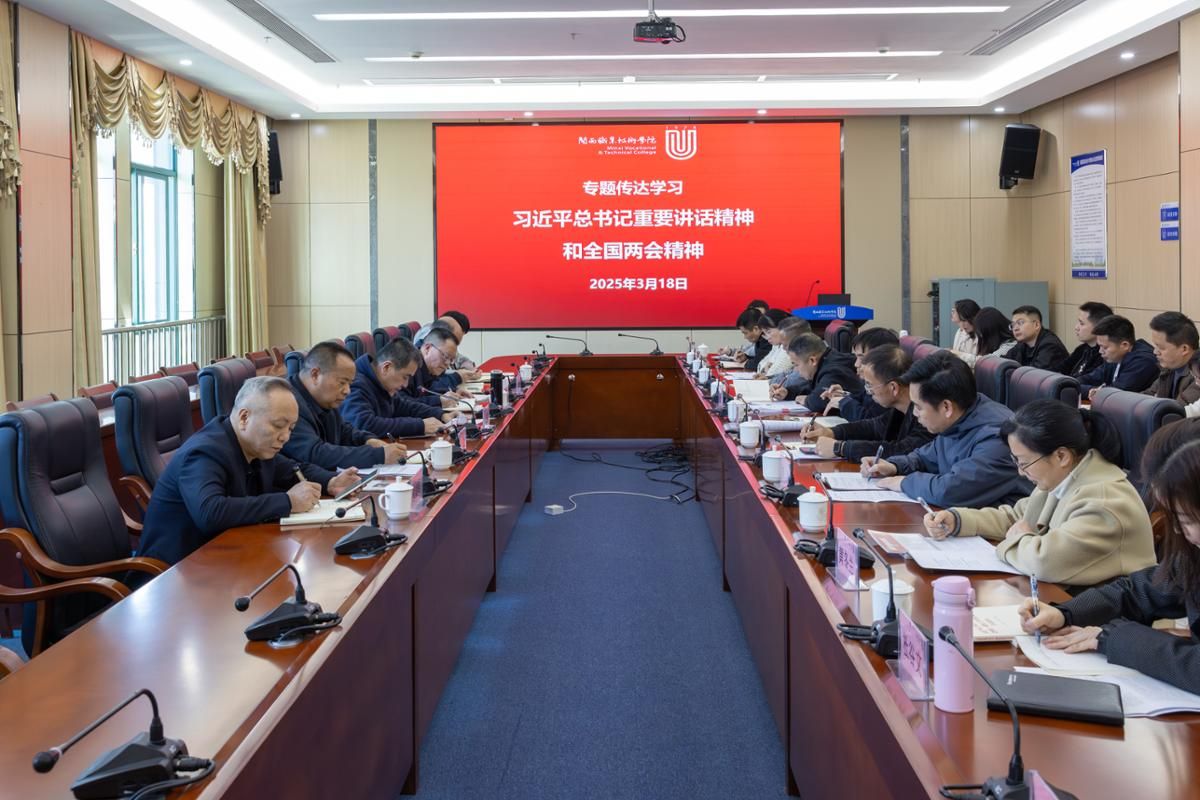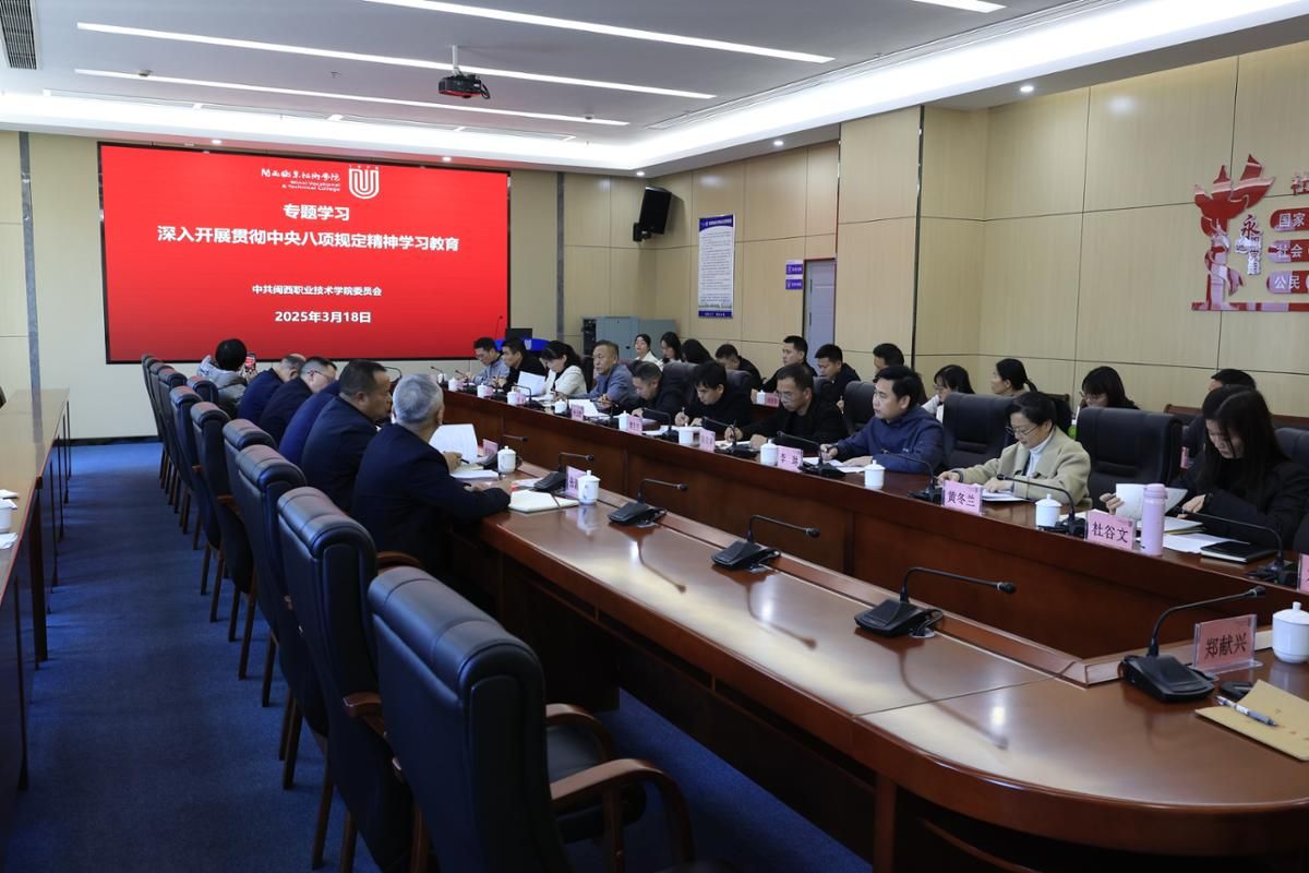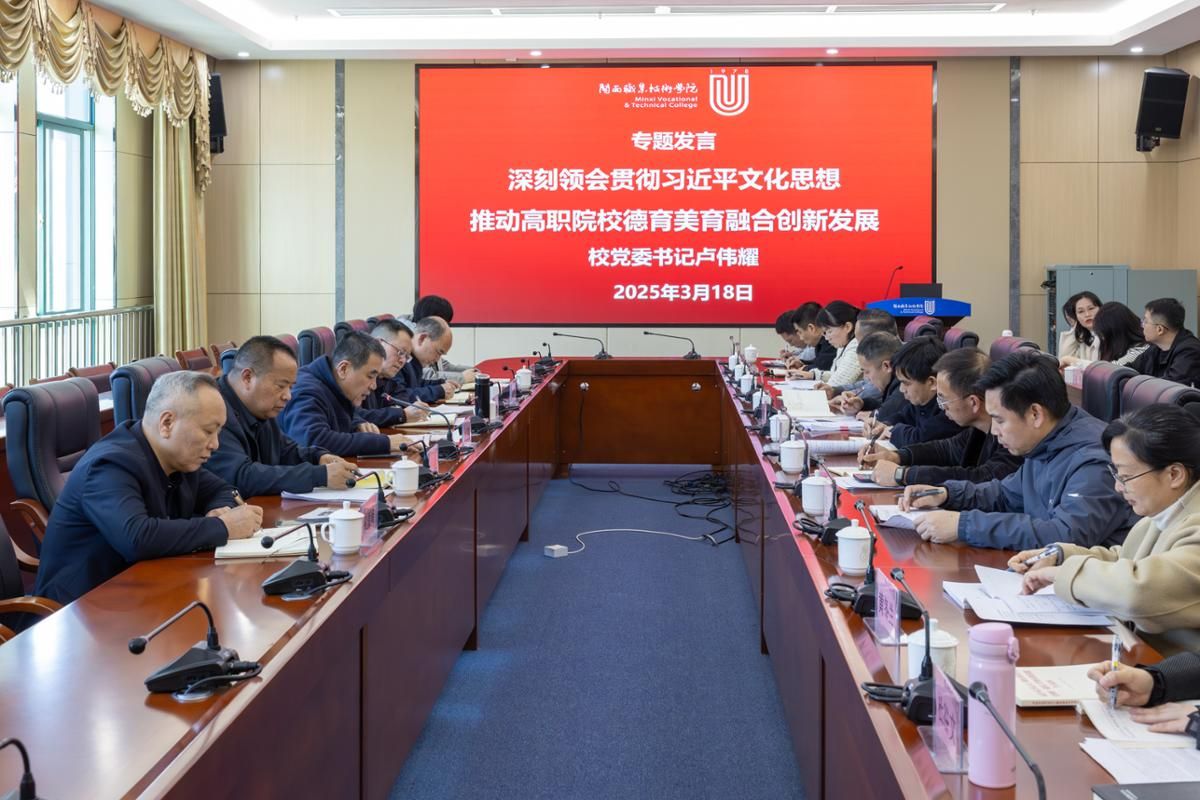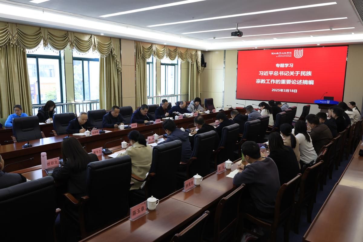 2025年3月18日下午,校党委在岩声楼二楼会议室召开理论学习中心组2025年第四次学习(扩大)会暨《形势与政策》备课会,学习(扩大)会以“文化使命 融合创新 凝心聚力 培育新人”为主题,深入学习贯彻习近平文化思想、习近平总书记关于做好新时代党的统一战线工作的重要思想和习近平总书记关于思政课建设重要讲话精神,认真传达学习习近平总书记重要讲话精神和全国“两会”精神,专题学习《中共中央办公厅关于在全党开展深入贯彻中央八项规定精神学习教育的通知》,集体学习《中共中央八项规定及实施细则》。