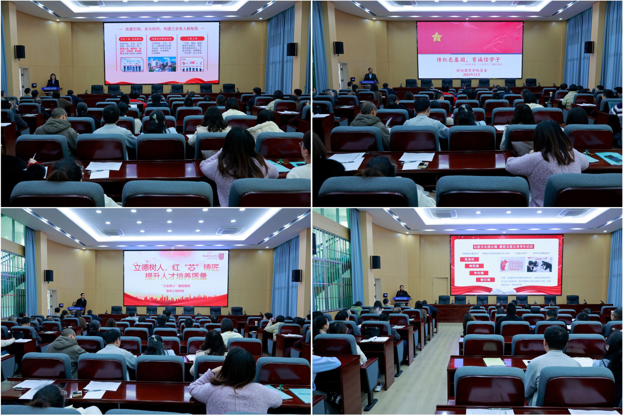 分享会上,智能制造学院副书记丘文婷以《构建“三全”育人新格局 谱写工匠培育新篇章》为题、财经商贸学院副书记邓连文以《传承红色基因,打造红色财院》为题、信息工程学院副书记刘剑友以《立德树人,红“芯”铸匠,提升人才培养质量》为题、医护学院副书记黄强华以《传承红医文化,笃学修德精医》为题,依次分享了在“三全育人”综合改革中的实践路径和取得的成效。分享会结束后,卢伟耀书记进行了点评,并对下一步工作提出了要求。