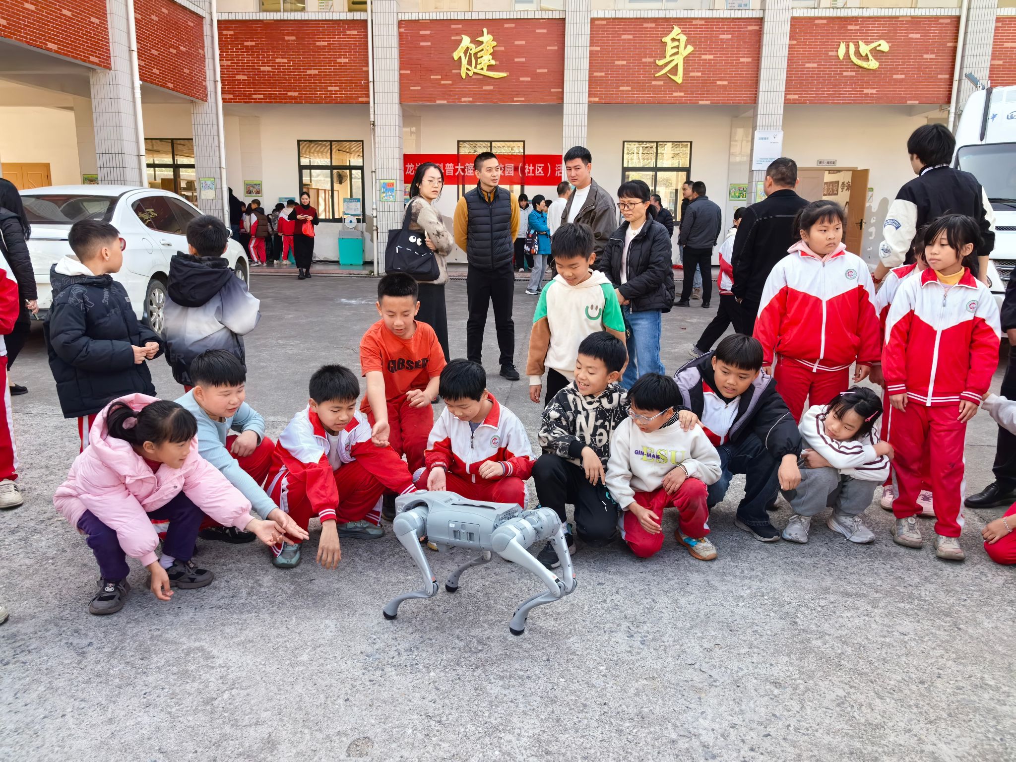 在大池中心小学,支部成员带来了“科普大篷车进校园”活动。通过机器狗表演、科学体验等形式,为乡村孩子们带来了一场别开生面的科技启蒙课。孩子们围在灵动的机器狗旁,不时发出惊叹与欢笑,在互动体验中近距离感受科技的魅力,激发了对科学探索的浓厚兴趣。