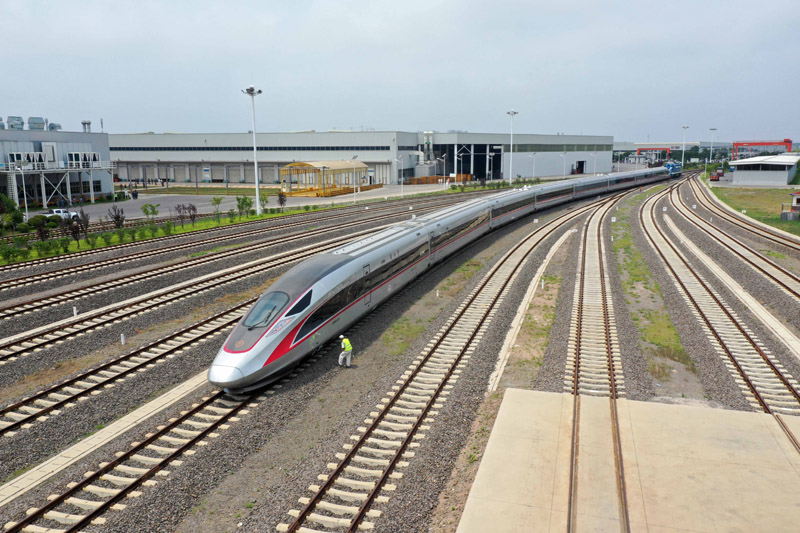 在位于山东青岛的中车四方股份公司,一辆复兴号列车正在出厂(2021年7月1日摄)。新华社发