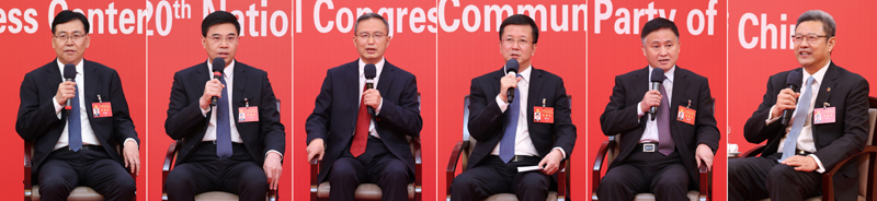 10月20日,中国共产党第二十次全国代表大会新闻中心举行集体采访。青海、宁夏、新疆、中央和国家机关、中央金融系统、中央企业系统(在京)代表团新闻发言人出席,介绍代表团学习讨论党的二十大报告情况,并回答记者提问(拼版照片)。