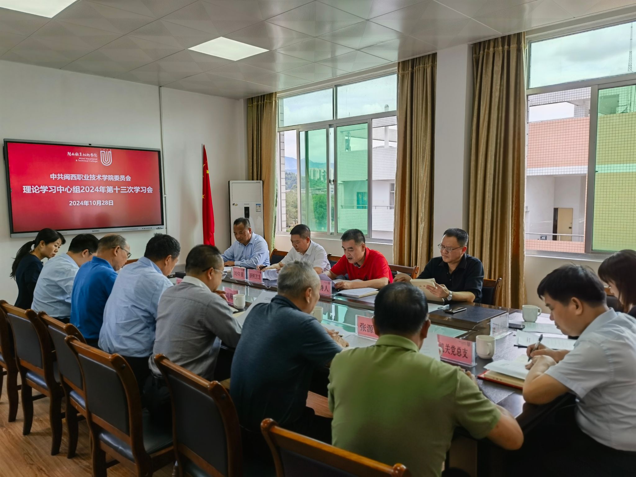 10月28日下午,校党委理论学习中心组2024年第十三次学习会在协成楼六楼会议室召开,学习会专题传达学习习近平总书记在庆祝中华人民共和国成立75周年招待会上的重要讲话精神、习近平总书记在中华人民共和国国家勋章和国家荣誉称号颁授仪式上的重要讲话精神,专题学习习近平总书记在全国民族团结进步表彰大会上的重要讲话精神,认真学习习近平总书记在党的二十届三中全会第二次全体会议上的重要讲话,认真学习习近平同志《论教育》。