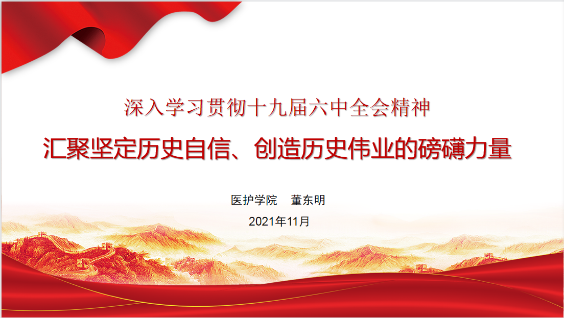 医护学院党委负责人以《深入学习贯彻十九届六中全会精神,汇聚坚定历史自信、创造历史伟业的磅礴力量》为题,从十九届六中全会概况、《中共中央关于党的百年奋斗重大成就和历史经验的决议》主要内容、两个“确立”的深刻内涵、中国共产党的三个“历史决议”及如何贯彻等方面深入解读十九届六中全会精神,全面介绍《中共中央关于党的百年奋斗重大成就和历史经验的决议》的重大意义和精髓要义,深刻阐述“两个确立”的决定性意义,为入党积极分子带来一堂生动的党课。