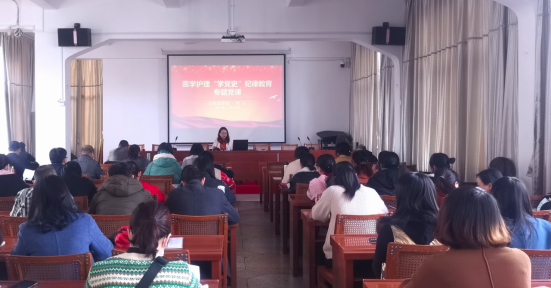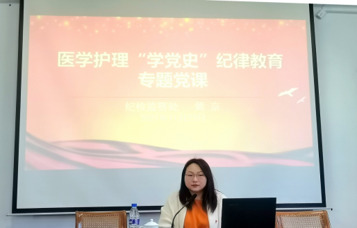 11月23日下午,医护学院邀请纪检监察处副处长黄京,为全体党员讲“学党史”纪律教育专题党课。