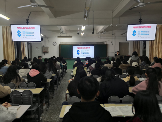 12月22日晚,医护学院于606教室举办《闽西红医与红医精神》专题讲座,由古田干部学院、中共龙岩市委党校王咏梅副教授主讲,院领导、党支部委员、辅导员、班主任和训导师代表、21五年专和红医读书社等100多名师生参加。活动过程中,王咏梅教授围绕闽西红医精神的情怀贡献、红医精神的深刻内涵、新时代弘扬红医精神三部分展开阐述。她讲述了不同时期闽西红医的发展,并从闽西红医的革命事迹诠释了红医精神内涵的四个方面内容。王教授表示伟大的抗疫精神也是红医精神的体现:舍生忘死,生命至上,举国同心,命运与共。最后,王咏梅教授与在场同学进行了互动交流,勉励大家厚植家国情怀,筑牢信仰之基,踏实学习,把个人命运同中华民族伟大复兴中国梦相结合,传承红医精神,肩负起新时代的伟大使命。