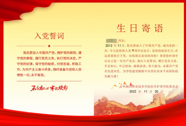 为深入学习宣传贯彻党的二十大精神,强化党员政治身份认同感,12月6日医学护理学院党委开展第四季度“政治生日”活动。政治生日以“五个一”为载体,通过“送上一则生日祝福”、“佩戴一枚党员党徽”、“重温一次入党誓词”、“接受一次政治洗礼”、“分享一次党员感悟”的方式,医护学院第四季度入党的党员同志庆祝“政治生日”