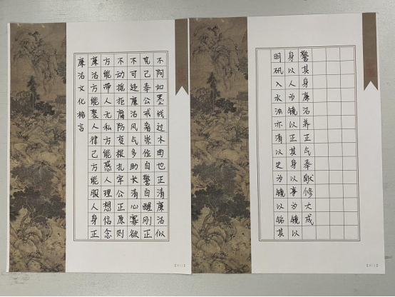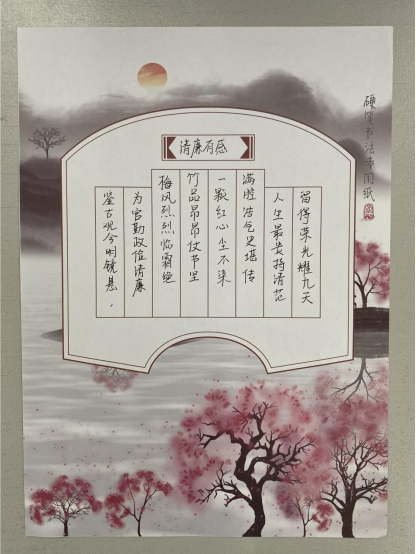 本次比赛以“树清廉,传家风,促家和”为主题,同学们积极响应,踊跃报名参加,紧扣廉洁自律、宿舍和谐主题,同学们发挥自身长处,利用书法、绘画的形式展示廉文化作品,对作品内容及意义进行介绍,人人争当扣好第一颗“廉洁扣”的宣传员。经过激烈的角逐,有《爱莲说》等十五幅优秀的作品突出重围,最终评出了一等奖一名,二等奖两名,三等奖三名,优秀奖四名。医护学院党员负责人对参赛作品高度赞誉,作品发挥廉政文化的教育、示范、熏陶和导向作用,且表达了医护学子对廉洁的思考和认识。