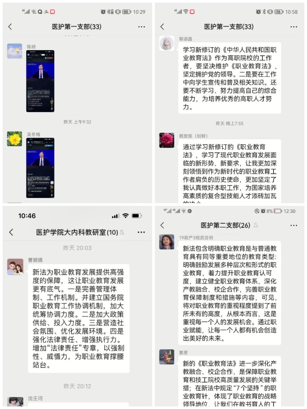 医护学院高度重视此次宣讲大会,提前安排、有序组织全院教师参加线上学习。院领导班子成员、专业负责人、专业教师和党员们观看了在线直播,学习新职业教育法修订的专家辅导报告。线下,通过理论学习中心组“集中学”、教职工大会“大家讲”、党支部学习“再研讨”、教研室学习“结合做”等多种方式,教师们纷纷发表学习感想,表示新《职业教育法》的修订出台,对整个职业教育战线来讲,都是一件大事、喜事、盛事。作为高职院校教师,深深感受到我国职业教育事业的春天来了!新《职业教育法》为解决现存的职业教育遇到的一系列难题扫除了法制上、政策上、社会地位上、思想观念上的障碍,有利于促进职业教育高质量发展。
