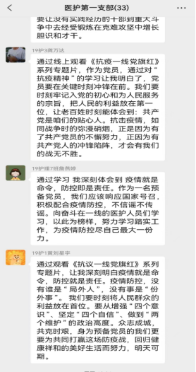 4月21日、22日下午,医护学院3个党支部分别组织开展主题党日活动,通过观看《抗疫一线党旗红》系列专题篇,以座谈会的形式交流学习体会。医护学院党员通过线下加线上相结合的方式参与到主题党日活动中。