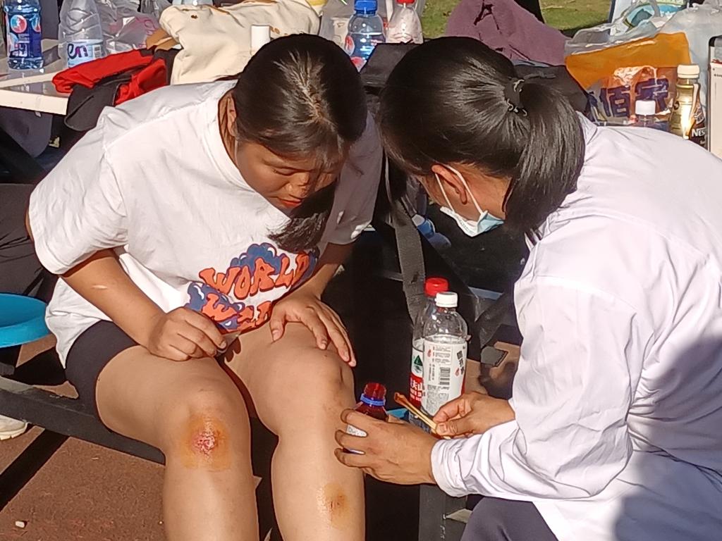 赛场上运动员奋力拼搏,赛场外医护学院党员教师贴心守护,为运动健儿保驾护航。运动会期间,6位党员教师一直坚守在医疗保障点,为体能消耗较大的运动员补充葡萄糖,为受伤者做清创处理,必要时用绷带包扎,为扭伤的运动员进行冰敷、喷涂云南白药,为本届运动会提供了有效的医疗救援服务,把专业特长奉献在运动场上,把先锋模范作用落到实际工作中,将服务师生最后“一公里”落到实处。