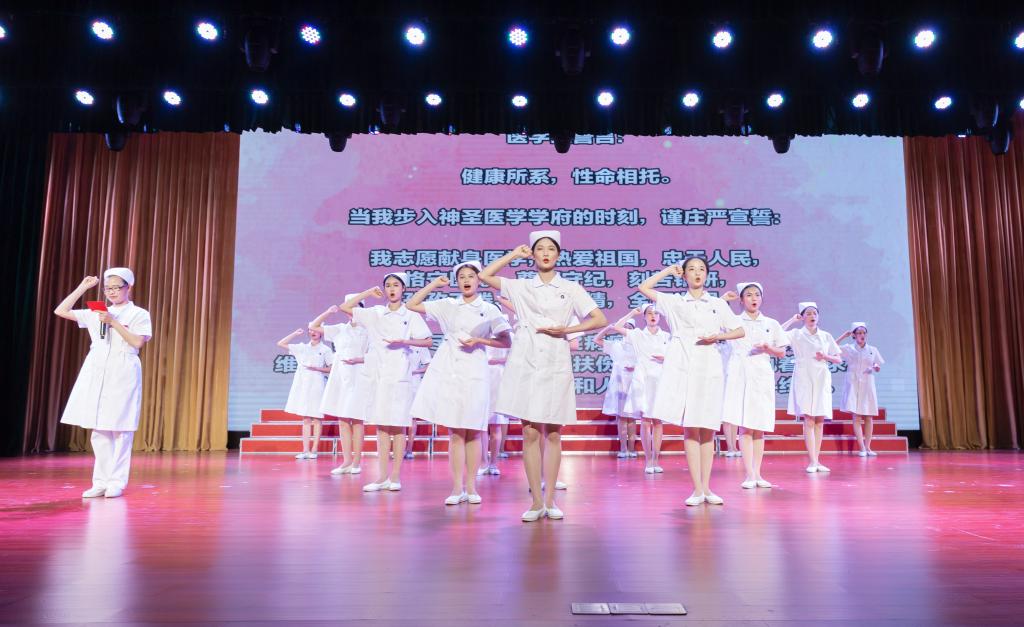 晚会现场,20名护理专业学生代表缓步上台,由医护学院老师为她们戴上圣洁的燕尾帽,并把象征南丁格尔精神的蜡烛传递到她们手中,学子们在老师的带领下庄严宣誓。
