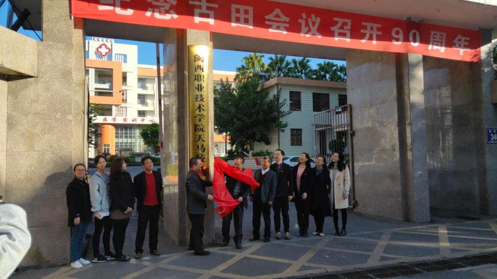 2020年1月8日天气微凉、微风飒爽,校园内外,喜气洋洋。上午8时30分,天马校区揭牌仪式在校区正门口举行。学校党委委员、副校长卢兆梅,院党委书记董东明,院长曹文元,院党委副书记卢湘海及学院教师代表出席仪式。