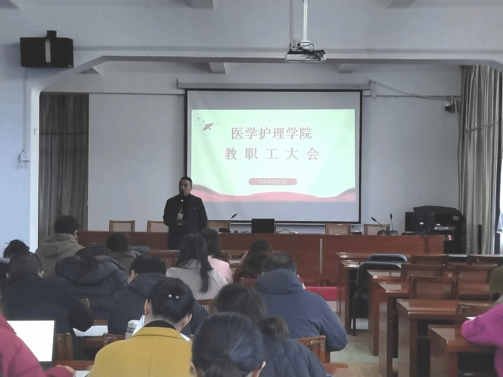 2月27日下午,医学护理学院在新学期之初成功举行了全体教职工大会。会议内容丰富,涵盖了学院行政管理、教育教学、学生就业指导、党风廉政建设以及学术前沿探讨等多个层面,旨在明确新学期的工作重点,推动学院的转型,并引导广大教职工紧跟时代步伐,积极应对人工智能带来的挑战。