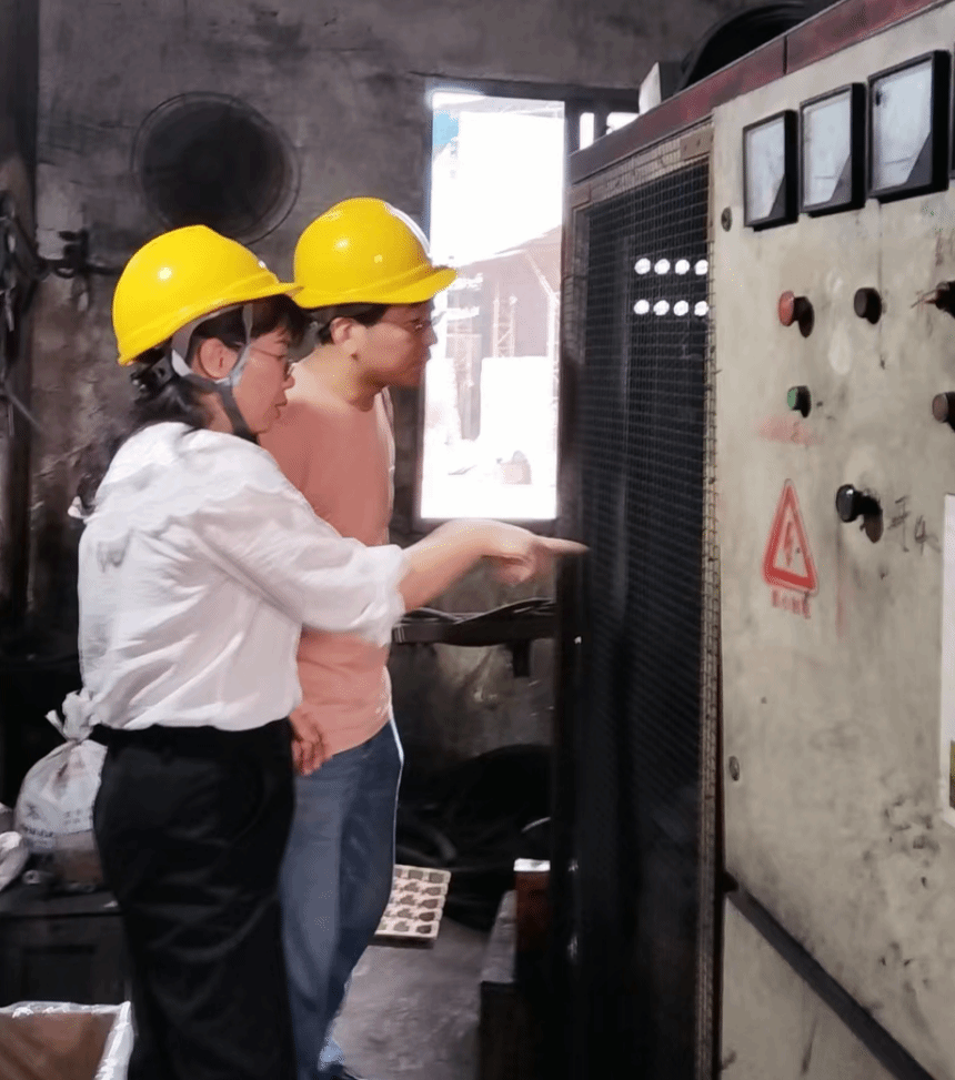 校企师资团队深入双峰机械的中频炉生产作业现场,详细了解中频炉的运行状况、设备参数以及日常操作流程等细节,与企业技术人员进行了深入的交流。同时在实地查看中频炉的过程中,对炉体结构、加热元件、隔热材料、电气控制系统等关键部位进行了全面而严谨的实地测量记录,记录了现场运行数据,将为后续制定科学合理的改造升级技术方案提供坚实的依据。
