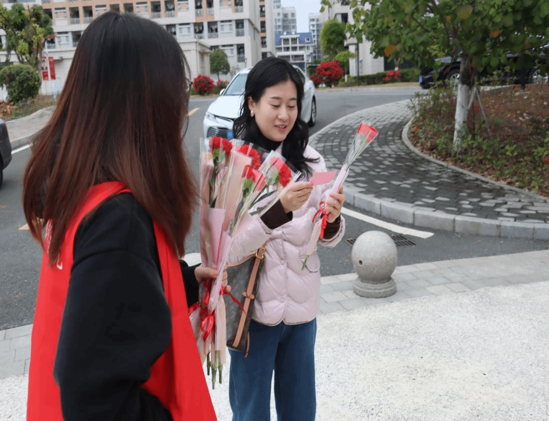 活动当天,校园各处,如教室、宿舍区等地,都成为传递温暖的重要场所。心理协会的志愿者们早早到位,为过往女师生送上精心挑选的鲜花和饱含深情的祝福卡片。这一贴心举动,让女师生真切感受到学院的关爱与尊重,幸福感和归属感油然而生。在“花漾指尖:师生插花共绘芳华”活动中,师生齐聚一堂,发挥创意、融入情感,共同打造独属于自己的浪漫花束,增进了彼此情谊。此外,学院还组织“卡片漂流 温暖互换”活动。大家拿起笔,将心底最真诚的话语写在祝福卡片上,随后参与随机交换,邂逅他人的真挚祝福,收获意外惊喜,让爱与美好在校园流动。