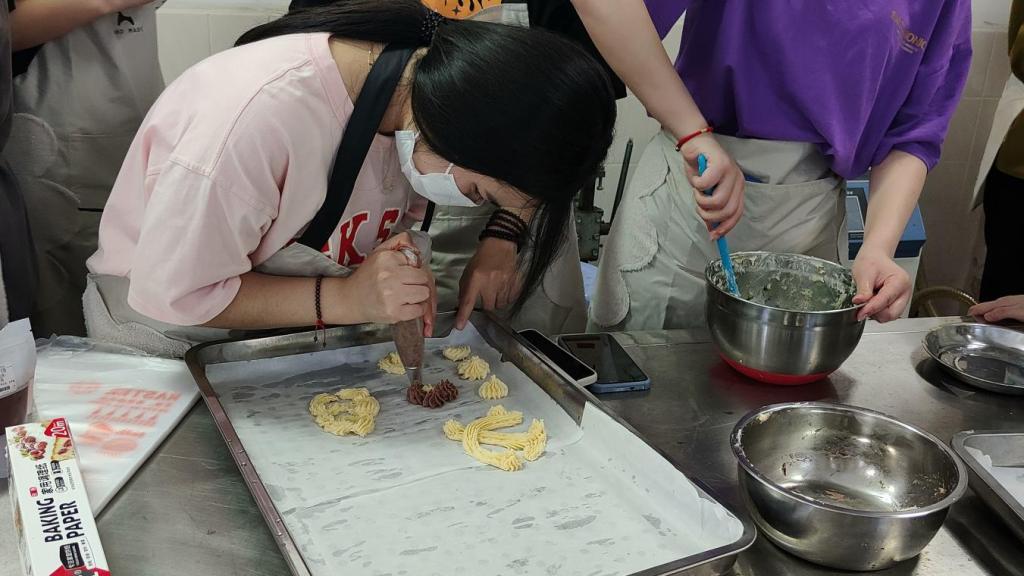 在活动中,食品检验检测技术专业老师为同学们讲解本次活动的步骤及注意事项。同学们按照老师所讲述的操作步骤,自己动手制作小饼干和纸杯蛋糕。大家分工合作,忙得不亦乐乎。制作过程中,曲奇饼干组仔细认真的在烤盘上绘制“劳动教育”“敬业爱国”等字样,蛋糕组用奶油蛋糕胚上表光出“闽大观”“建团百年”“劳动快乐”等字样,以此来表达青年学生对建团100周年的祝福,也展示所学专业技能,现场气氛热烈,受到了师生的一致好评。通过此次劳动教育,同学们不仅了解到了蛋糕的整个制作过程,也感受到了一个蛋糕背后包含着的辛勤劳动;亲手制作中,锻炼了同学们的动手能力,同时也感受到了劳动的快乐。