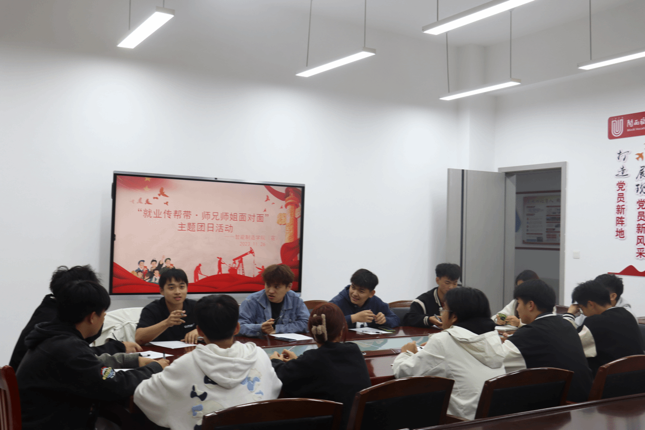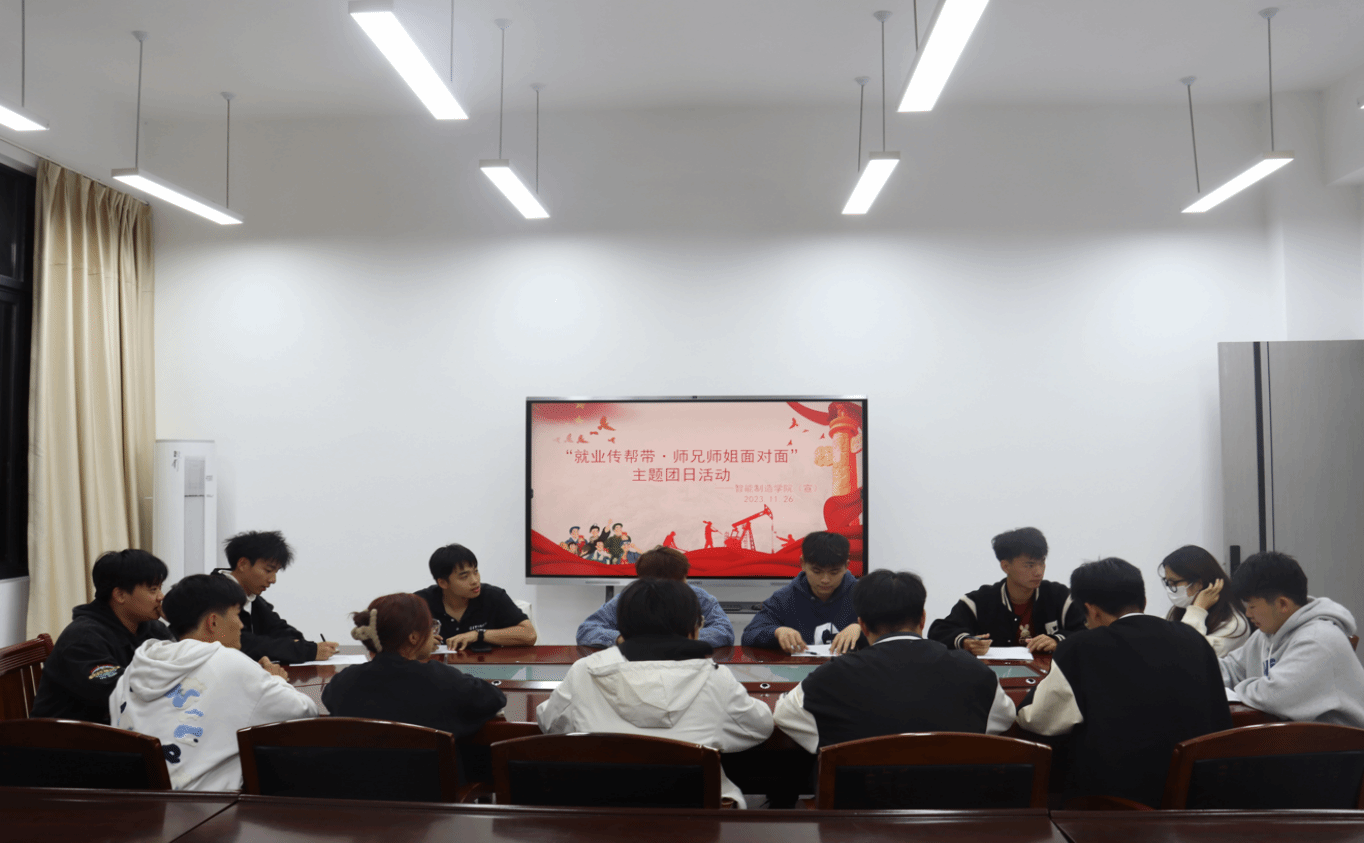 为更好地帮助智能制造学院在校学生树立远大理想和自立自强的求学信念,提升他们对自己本专业的认识和理解,也为架起新老生之间的友谊桥梁,2023年11月26日,智能制造学院于辛耕楼216召开就业引航“就业传帮带·师兄师姐面对面”主题团日活动。21机械制造及自动化专业的杨文杰和黄鑫杰、21环境工程技术专业的林晨昕等三位师兄,与22、23级的学生代表十余人进行了面对面互动交流。另外,校外实习的师兄师姐们为同学们录制了关于实习、就业感想、体会、建议的视频,11月25-11月30日,智能制造学院2022、2023级30个团支部分别在辛耕楼、良才楼、线上观看了上述视频。