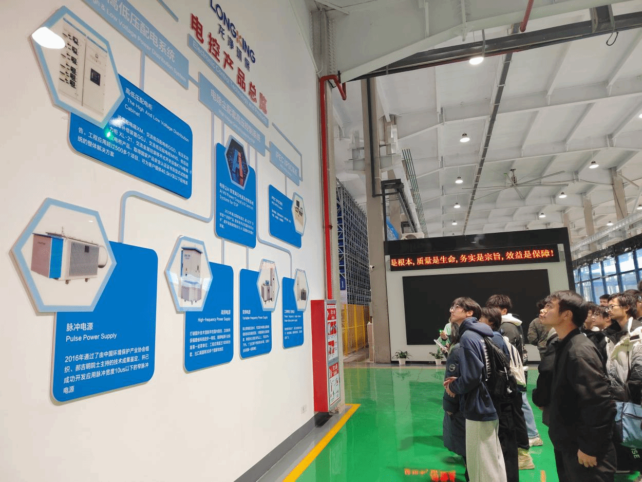 在学习过程中,龙净环保的技术专家为同学们系统介绍了环保装备电控系统的构成、关键电力电子技术的应用场景与工作原理,并结合实际生产案例进行了深入讲解。同学们通过实地参观电控设备生产装配线、核心控制器调试车间等,对理论知识在实际工业环境中的转化与应用有了直观且深刻的认识。