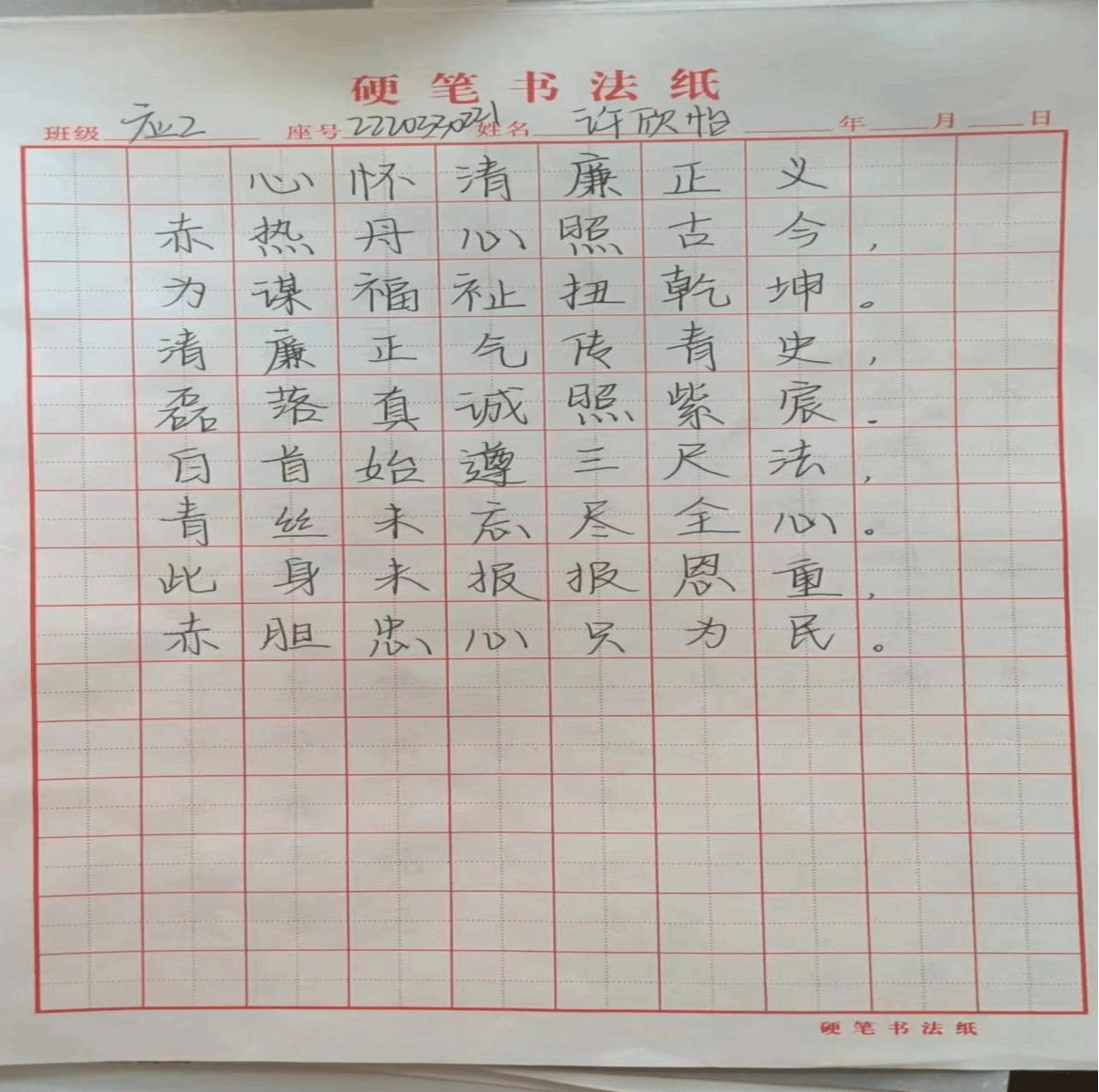 “廉文化”主题活动通过书法艺术的形式,展示了优秀的“廉政”书法作品。以学生为主体开展廉洁教育活动,展现了师生廉洁守正的精神风貌,倡导校园文化的风清气正。此次活动旨在营造风清气正的校园文化氛围,倡导全体师生树立正确的价值观和道德观,进一步加强自律教育。通过自主创作书法艺术作品,师生们能够深入思考和反思自身的廉洁修身之路,激发对廉洁的追求和承诺,坚守法律和道德底线,践行“予生最好学校”的建设理念。