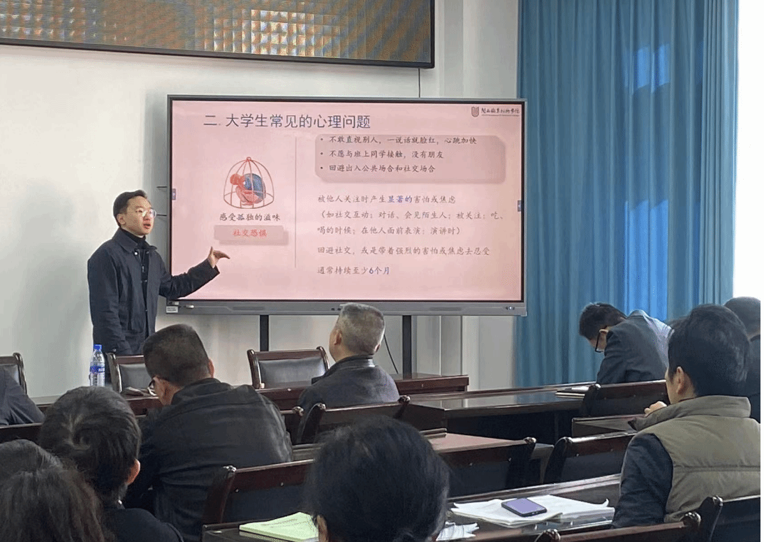 本次培训,葛老师分别从当前学生心理健康问题的严峻性、学生常见心理问题的识别及应对和学生谈心谈话技术三个切入点进行讲解。根据中国科学院心理研究所的研究数据来分析当前学生心理健康问题的严峻性,倡导将心理健康教育内容融入专业课堂、积极宣传心理健康教育知识,同时着重强调了非心理健康工作者协助处理心理危机干预的措施。在培训过程中,葛宾老师细心讲解如何识别和预防大学生心理问题,遇到学生心理危机该如何应对,以及如何更好地与学生进行谈心谈话,将解决学生思想问题与解决心理问题相结合,让在场的教师深刻地体会到关注学生心理问题的重要性和必要性。