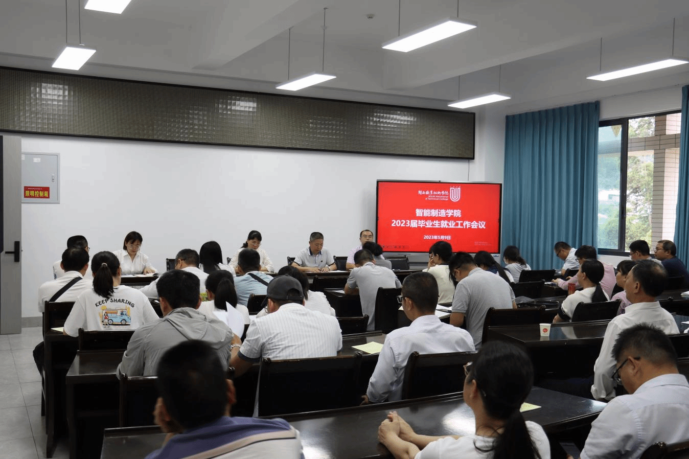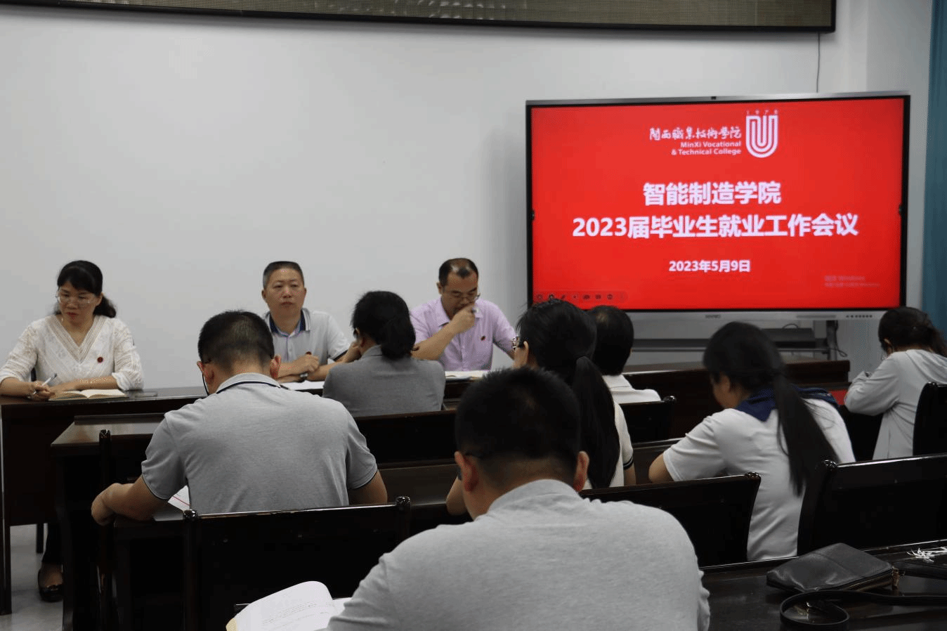 在深入开展学习贯彻习近平新时代中国特色社会主义思想主题教育之际,为全方位推进就业工作,对下一阶段工作进行部署,确保毕业生更充分更高质量就业,进一步压紧压实就业责任。5月9日,智能制造学院召开2023届毕业生就业工作推进会。学院全体教师参加会议,会议由学生工作负责人丘文婷主持。