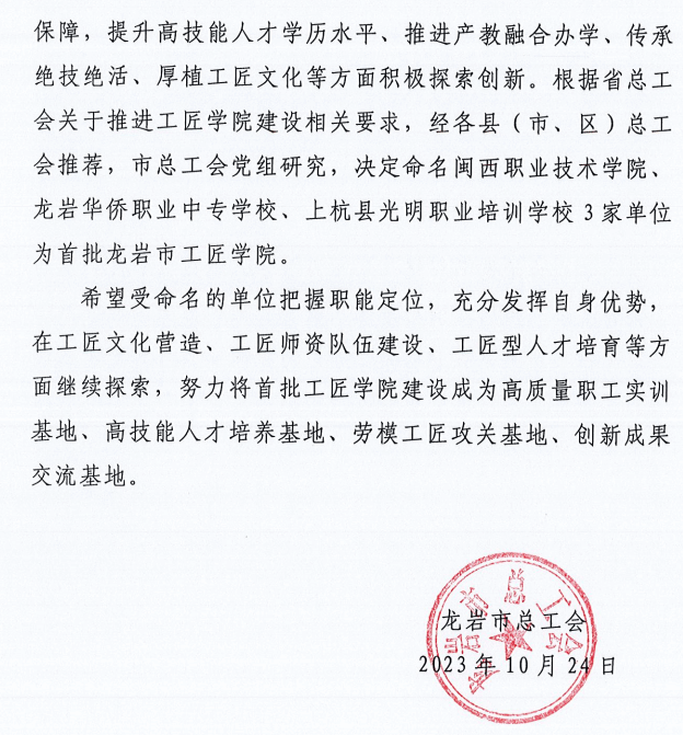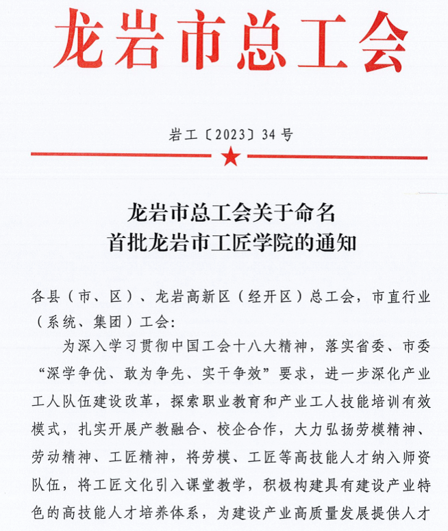 根据省总工会关于推进工匠学院建设相关要求,经各县(市、区)总工会推荐,市总工会党组研究决定,MG冰球突破官网受首批龙岩市工匠学院命名。这是对MG冰球深入学习贯彻中国工会十八大精神,扎实开展产教融合、校企合作,大力弘扬劳模精神、劳动精神、工匠精神,推进产教融合办学、厚植工匠文化等方面取得巨大成就的肯定。