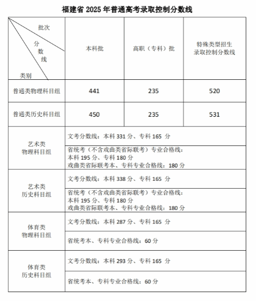 福建省2025年普通高考录取控制分数线