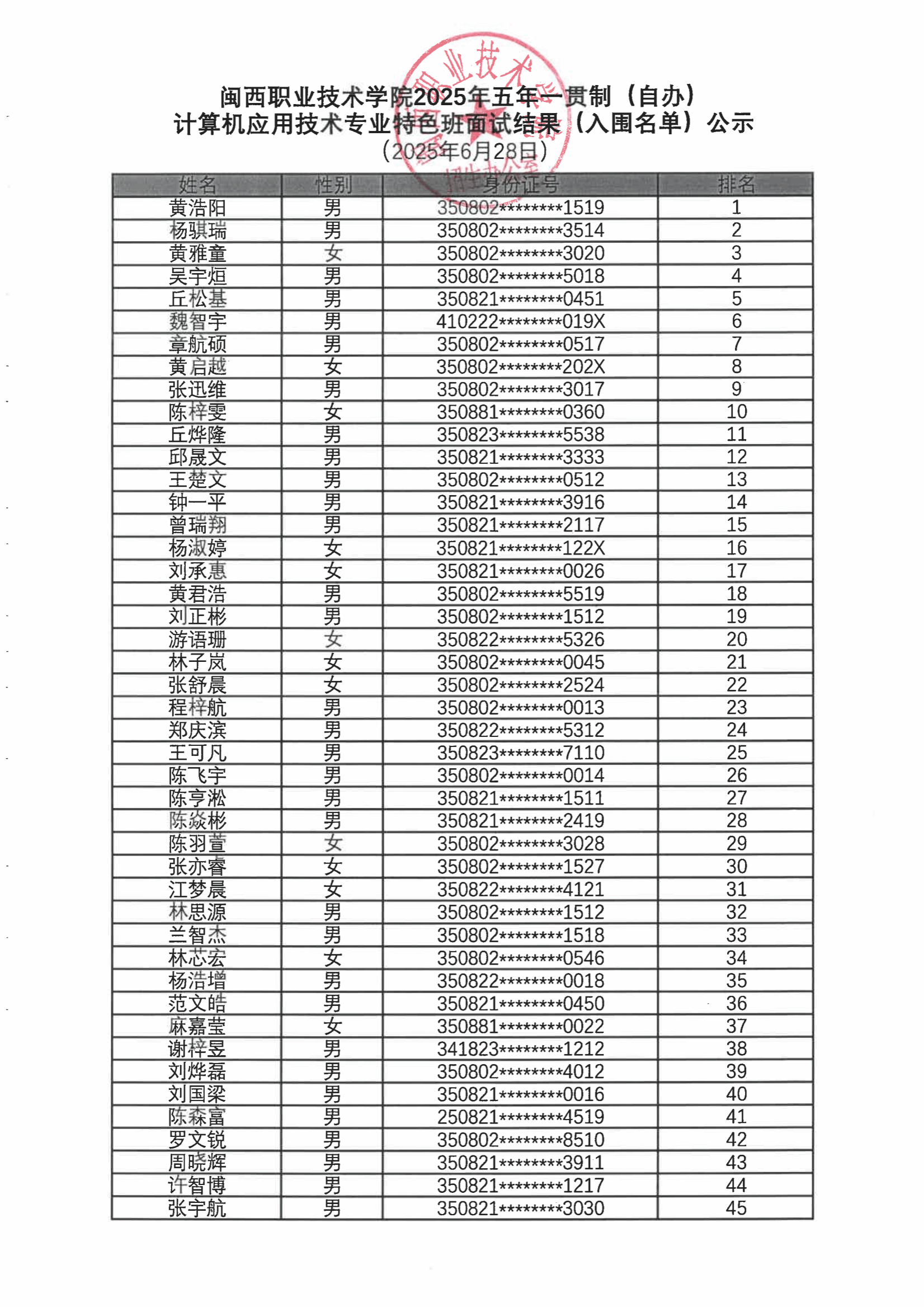MG冰球突破官网2025年五年一贯制(自办)计算机应用技术专业特色班面试结果(入围名单)公示
