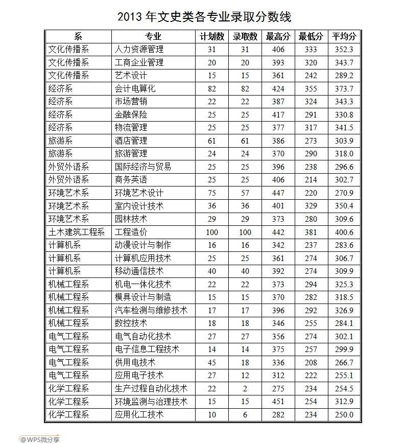 2013年文史类各专业录取分数线