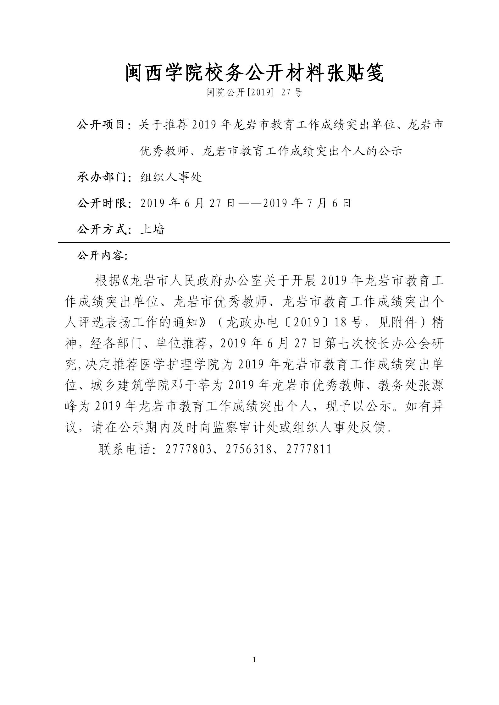 关于推荐2019年龙岩市教育工作成绩突出单位、龙岩市优秀教师、龙岩市教育工作成绩突出个人的公示