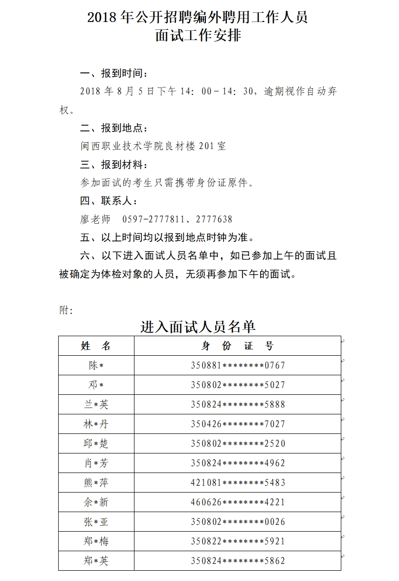 2018年公开招聘编外聘用工作人员面试工作安排及面试人员名单