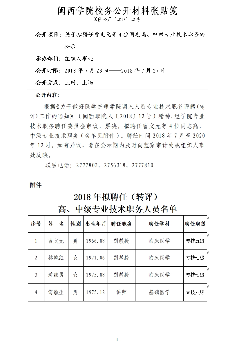 关于拟聘任曹文元等4位同志为高、中级专业技术职务的公示