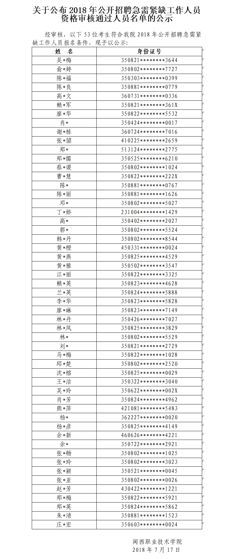 关于公布2018年公开招聘急需紧缺工作人员资格审核通过人员名单的公示