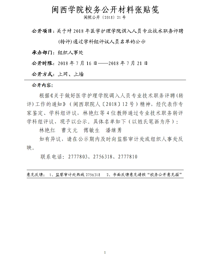 关于对2018年医学护理学院调入人员专业技术职务评聘(转评)通过学科组评议人员名单的公示