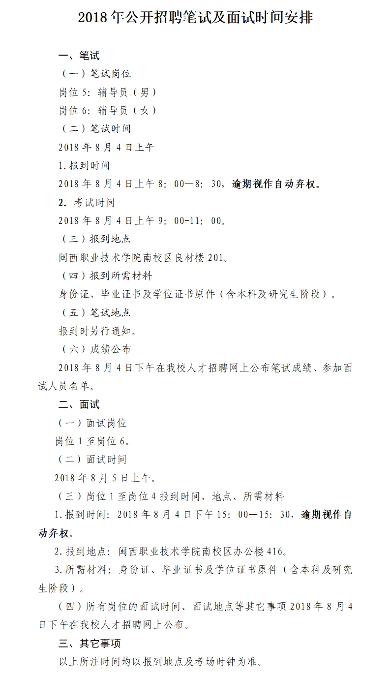 2018年公开招聘笔试及面试时间安排