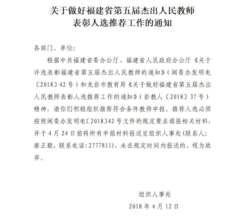 岩教人〔2018〕37号:关于做好福建省第五届杰出人民教师表彰人选推荐工作的通知.doc